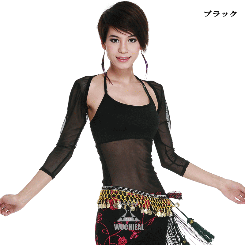 ダンス トップ 色鮮やかなオープンショルダーカットソー。フロント中心のヒモでギャザーをよせるとショート丈のトップスとしても着ていただけれます。踊った時にメッシュ素材の袖が優雅に揺れてステージ映えします。 ダンス衣装やレッスン着におすすめです。 ベリーダンス、ヒップホップ、 ...